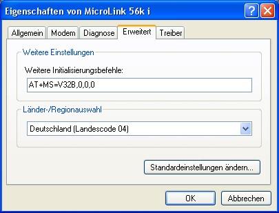 For a significantly more stable connection, the initialisation command AT+MS=V32B,0,0,0 should be written into the modem driver via the menu item “Extended Options“ under Start/System Properties/..//Modem Properties on the PC, see graphic.
