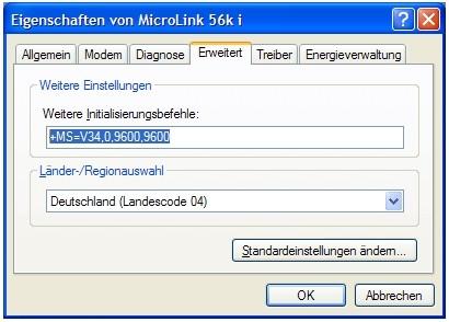 4th step: On the PC, again using Start/Control Panel/../Modem/Properties under "Advanced", delete the +MS=V34,0,9600,9600 initialisation command.
