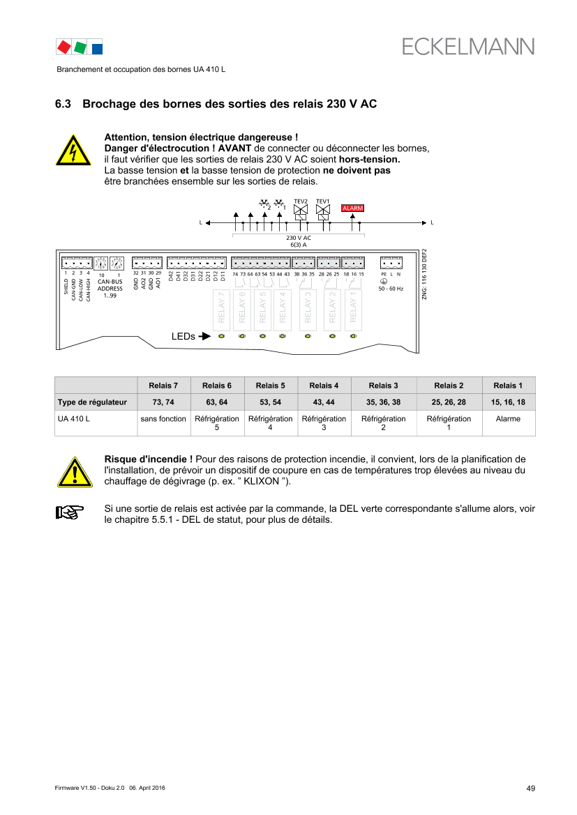 Terminal assignment of the 230 V AC relay outputs