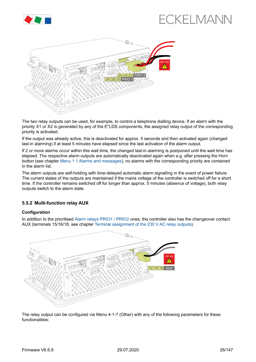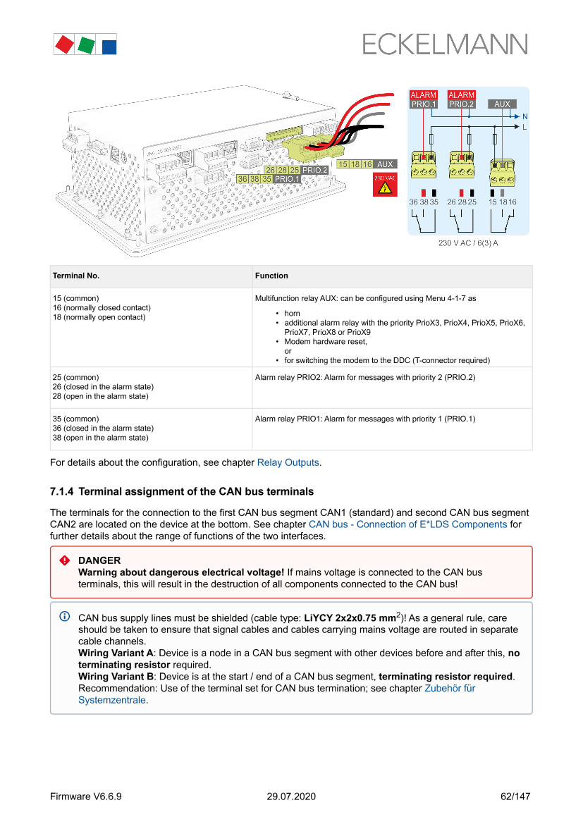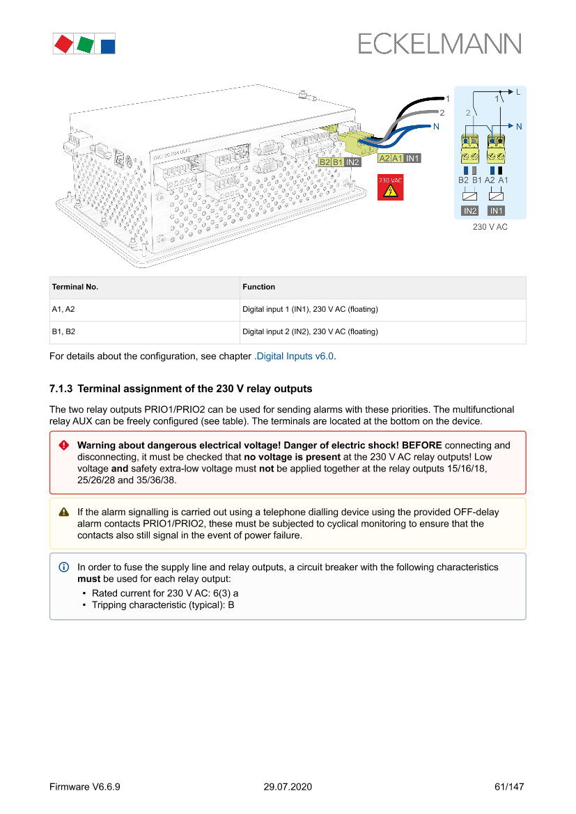 Terminal assignment of the 230 V relay outputs