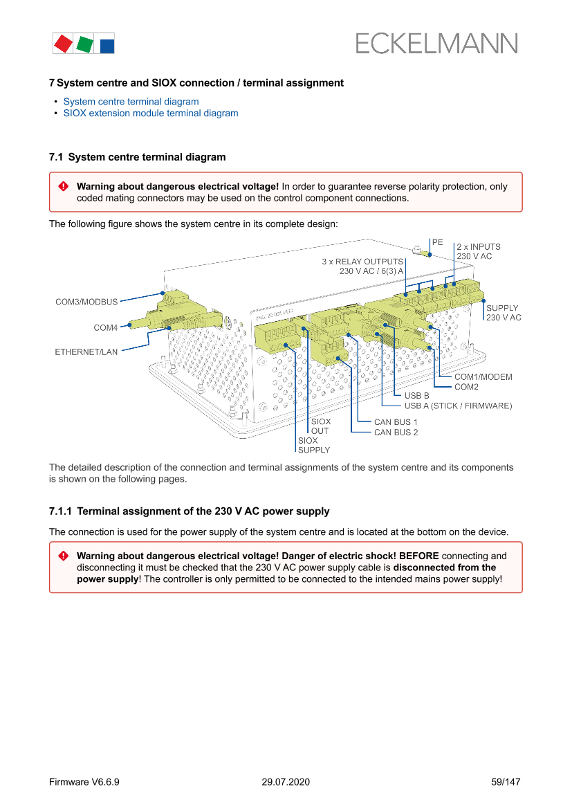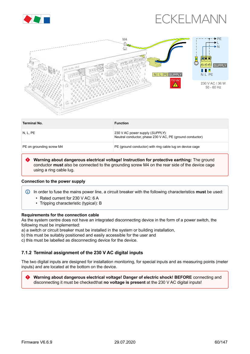 Terminal assignment of the 230 V AC power supply