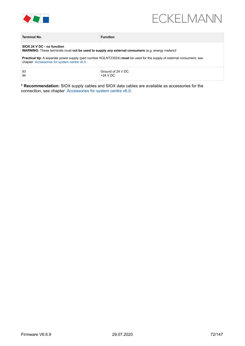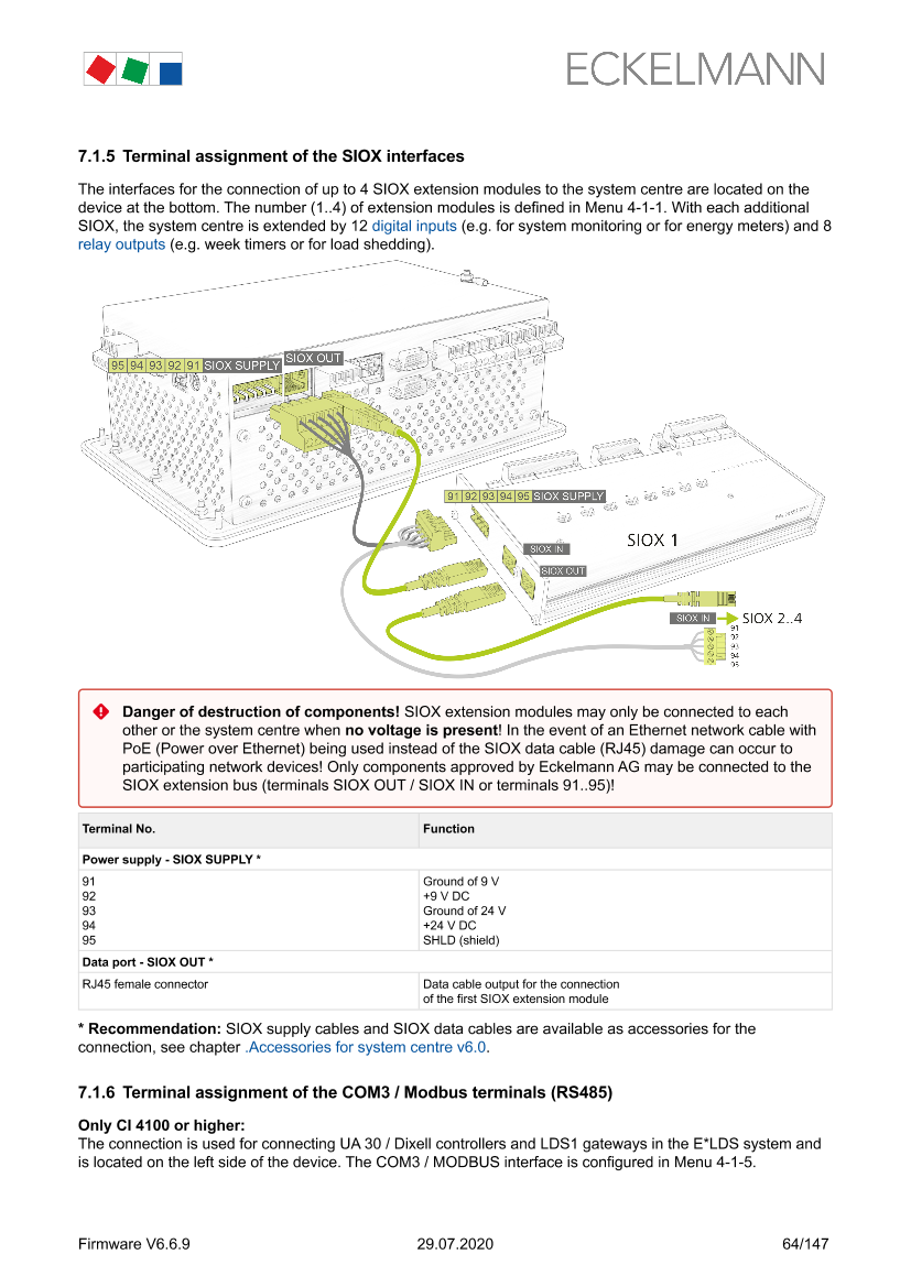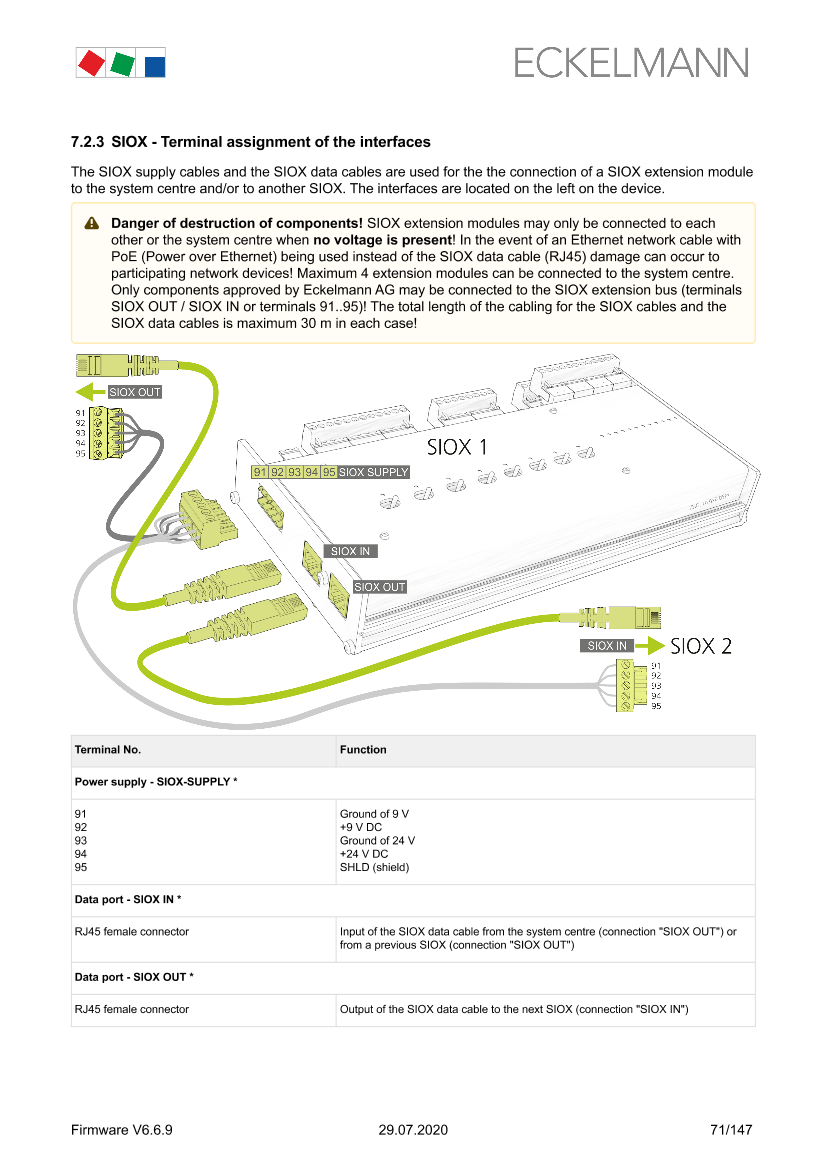 System centre and SIOX connection / terminal assignment
