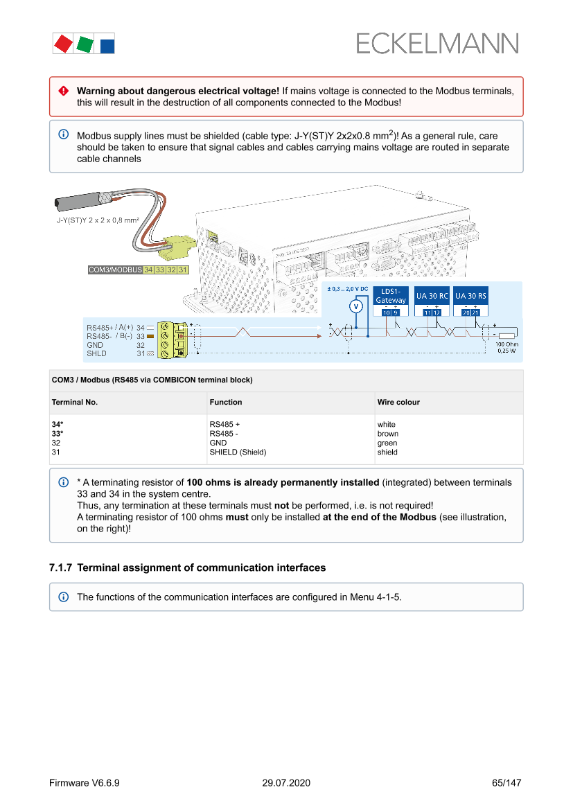 Terminal assignment of the COM3 / Modbus terminals (RS485)
