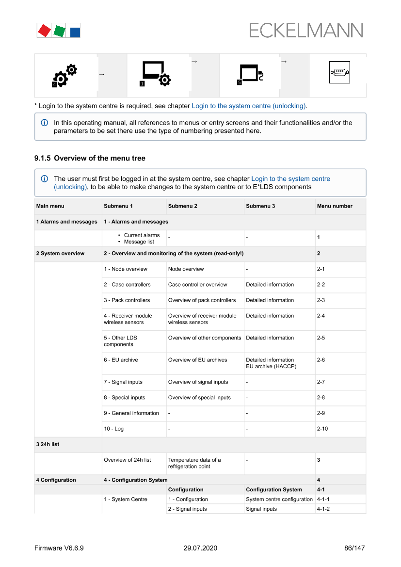 Menus of the system centre