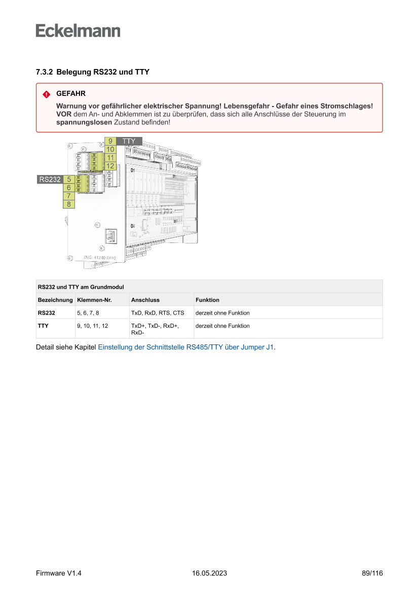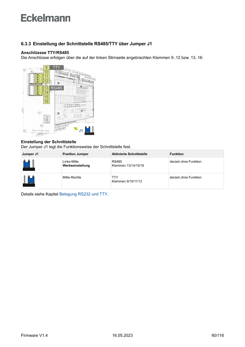 Einstellung der Schnittstelle RS485/TTY über Jumper J1