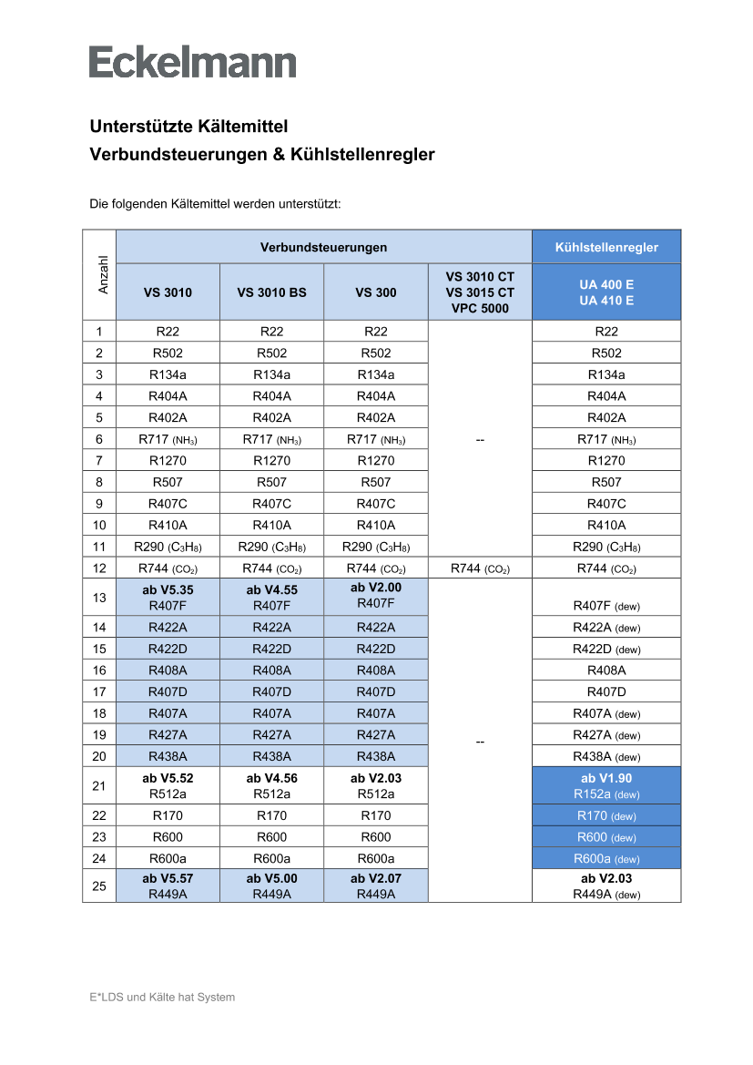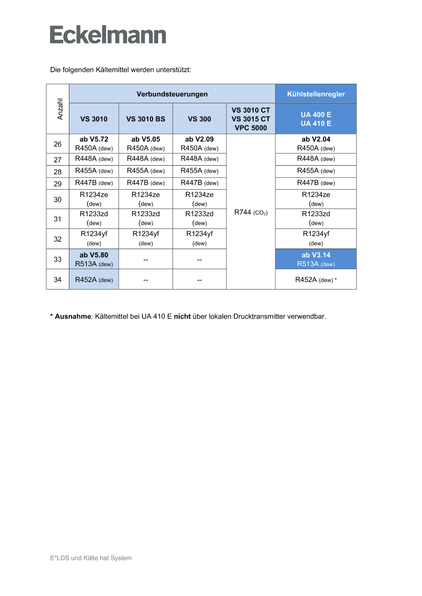 Unterstützte<br />Kältemittel im<br />E*LDS-System